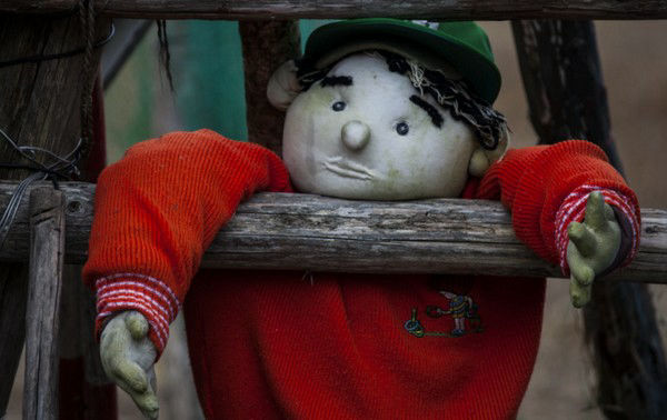 ツキミアヤノさんは11年前に大阪からこの村に戻り、10年前から人形を作り始めました。最初はすることがなく、畑に種を撒いてみても何も生えてこなかったので父親に似せたカカシを1体作り、それがすべての始まりになったとのこと。