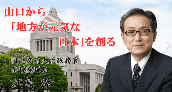 安倍首相の地元である山口県下関市の市長を1995年から4期務めた江島潔参院議員は、5選目に不出馬の意向を示して退任した2010年から加計学園系列の倉敷芸術科学大で客員教授を務めています。2013年4月に参院補選で平岡秀夫元法務大臣を破って初当選しました。第3次安倍第1次改造内閣にて国土交通大臣政務官に就任した2015年10月に辞職したとされています。