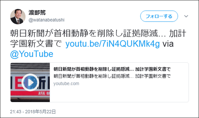 元衆議院議員の渡辺篤に至っては、これらのフェイクニュースサイトを元ネタとしたYouTube動画を拡散してしまいましたが、こちらも訂正も謝罪もありません。