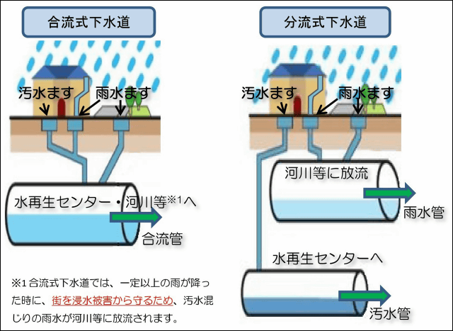 この合流式下水道では、家の屋根や道路などに降った雨水を流す雨水管とトイレの水を含む生活排水を流す汚水管が別れておらず、いずれも同じ合流管に流れ込みます。