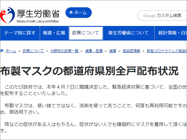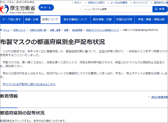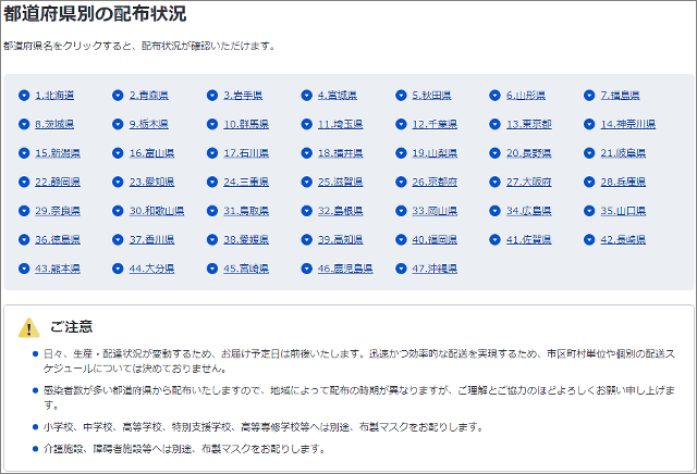 まず見てもらいたいのが、厚生労働省公式サイトにある「布製マスクの都道府県別全戸配布状況」というページ。
