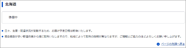 それでは早速各都道府県の配布状況(2020年5月7日現在)を見ていきましょう。早くからクラスターが発生していた北海道では残念ながら「準備中」とされており、配布は開始されていません。
