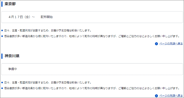 東京都は4月17日から配布しているものの、20日が経過した今も配布を終えていないようです。隣接する神奈川県も準備中のまま。