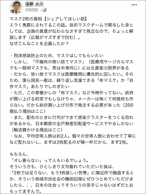 布マスク配布を企画した経済産業省の官僚が自らのSNSで拡散を求めた「マスク配布の真相」とやらはこちら。「ひとしきり文句垂れていただいた後は」など、アベノマスクに不満の声を上げた国民への皮肉も挟まれています。